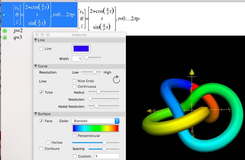 Under "Tube," the Resolution and Radial Resolution are set kinda low here to reduce the size of the "Torus_knot.gcx" file below. You can see the tube looks hexagonal like a pencil. I think it's Radial Resolution that fixes that. Gcx is the format of Grapher's files. As far as I know it's undocumented. Although Grapher was created by another company, it has that Apple attitude: treat the user like an executive who is smart enough to know what they want but doesn't want to muck about in geek details.